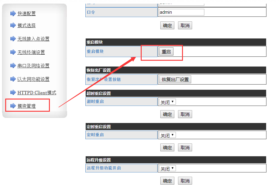 2、電腦瀏覽器地址欄輸入模塊默認(rèn)IP:10.10.100.254,賬號和密碼都是admin,進(jìn)入內(nèi)置網(wǎng)頁,模式選擇 -> 數(shù)據(jù)傳輸模式 -> 串口指令模式,點(diǎn)擊確定,串口及網(wǎng)絡(luò)設(shè)置 -> 網(wǎng)絡(luò)參數(shù)設(shè)置 -> 網(wǎng)絡(luò)模式配置為client,點(diǎn)擊確定,重啟模塊。
