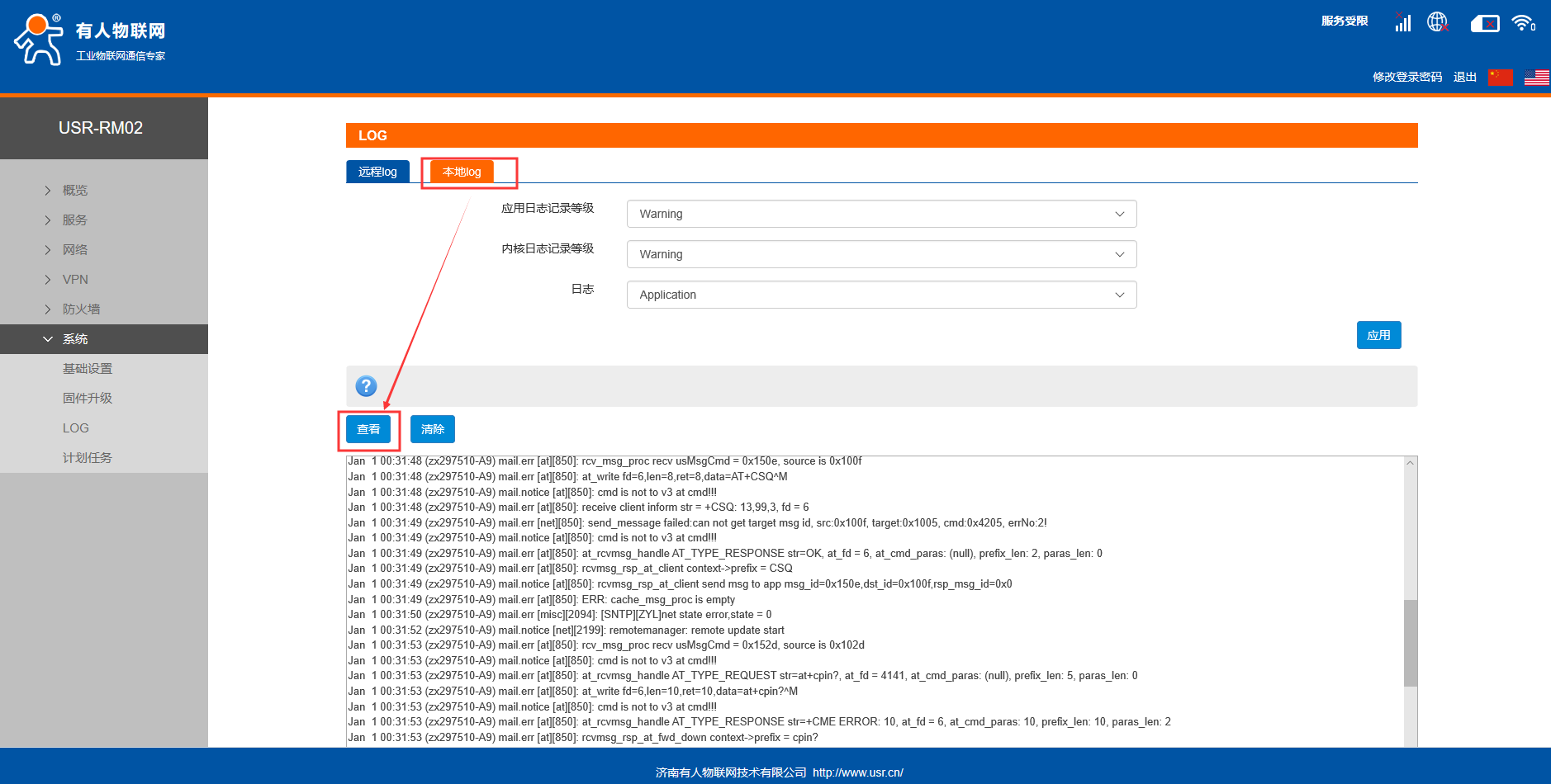 4.進(jìn)入系統(tǒng)LOG界面,可以看到有遠(yuǎn)程log以及本地log。選擇本地log,點(diǎn)擊查看可以看到當(dāng)前模塊的log信息