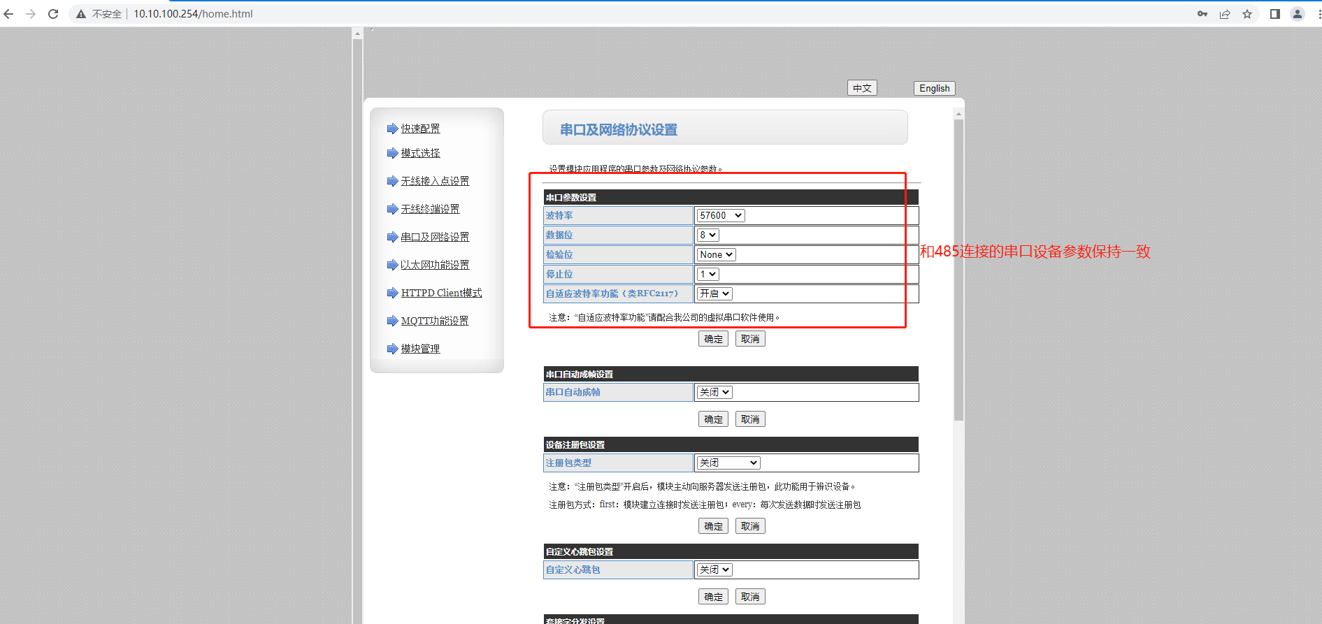 1、登錄之后,在【串口及網(wǎng)絡(luò)設(shè)置】,設(shè)置串口參數(shù)和終端設(shè)備保持一致(本案例使用USB轉(zhuǎn)485接電腦,使用串口調(diào)試助手模擬終端設(shè)備,所以以默認(rèn)參數(shù)為準(zhǔn)。)