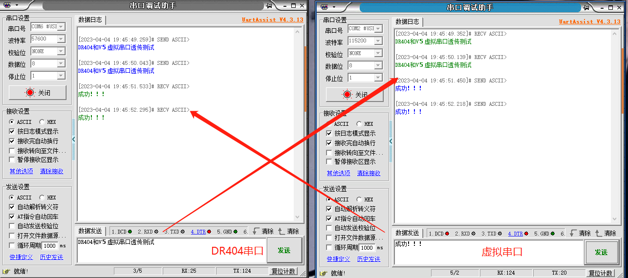 打開兩個(gè)串口調(diào)試助手,一個(gè)是虛擬串口,一個(gè)是DR404的串口,可以實(shí)現(xiàn)數(shù)據(jù)互傳。