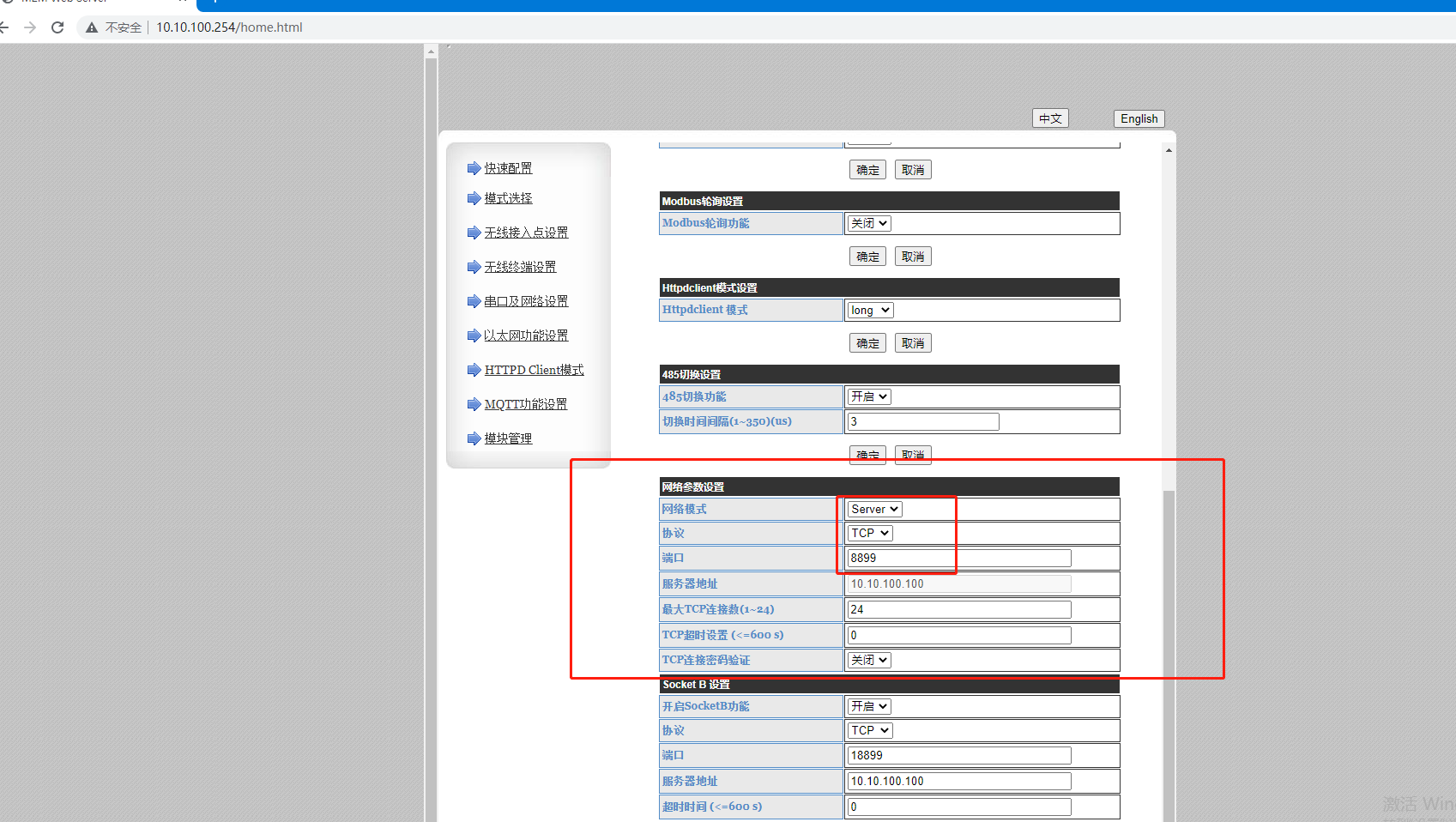 2、【網(wǎng)絡(luò)參數(shù)設(shè)置】設(shè)備默認(rèn)工作方式為Tcp Server,在此模式下只生效端口號(hào)。