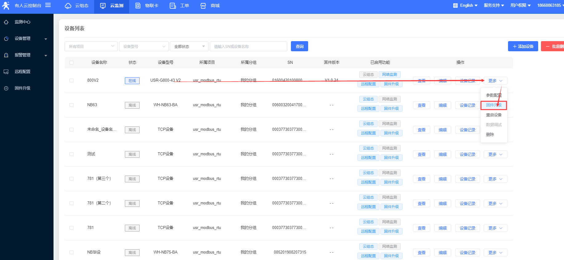 在“云監(jiān)測”的“設備列表”下,找到想要進行固件升級的設備,點擊“更多”,選擇“固件升級