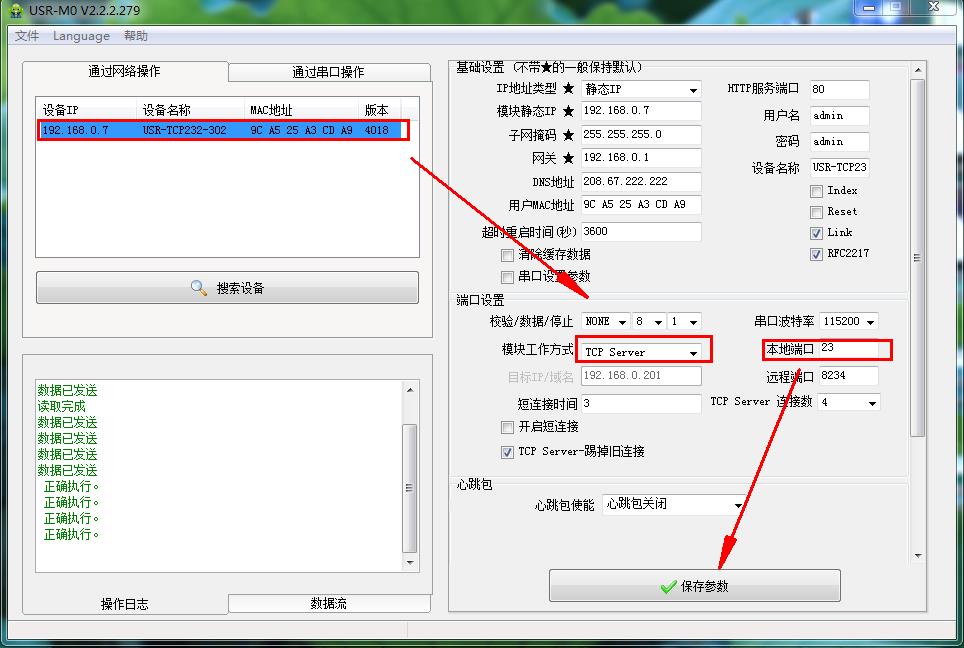 用M0配置軟件搜索設(shè)備,設(shè)置參數(shù)之后,2個USR-TCP232-302網(wǎng)線直連,或者都接同一個交換機。