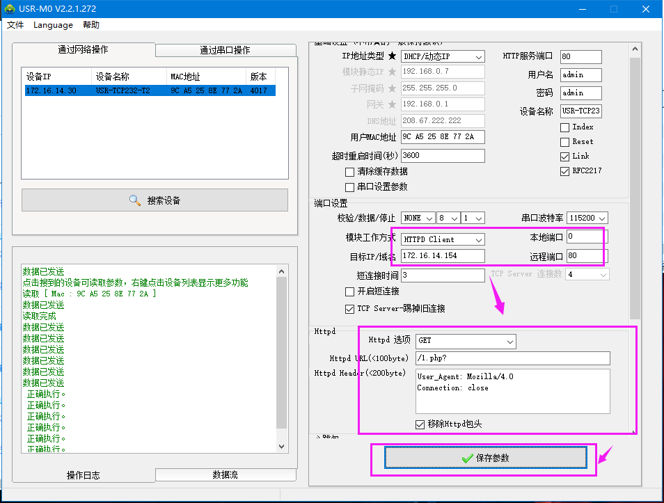 1.設(shè)置軟件設(shè)置,選擇httpd client 模式,局域網(wǎng)HTTP服務(wù)器地址:172.16.14.154 HTTP服務(wù)器端口號為80,HTTP報頭路徑為/1.php?,設(shè)置完成點擊保存設(shè)置。