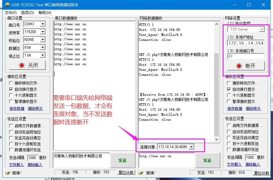 3.剛開始建立連接的時候,網(wǎng)絡(luò)端沒有連接對象,因為httpd連接是短鏈接,需要串口端先給網(wǎng)絡(luò)端發(fā)送一包數(shù)據(jù),才會出現(xiàn)連接對象,網(wǎng)絡(luò)端可以給串口端發(fā)送數(shù)據(jù),當沒有數(shù)據(jù)交互時,連接斷開。