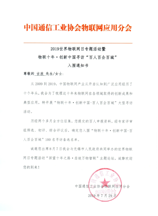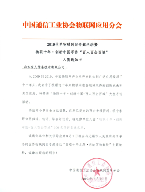8月1日,中國通信工業(yè)協(xié)會公布“物聯(lián)十年·創(chuàng)新中國--百人百企百城”主題活動入選名單。山東有人信息技術(shù)有限公司入選“物聯(lián)十年·百企”名單,公司創(chuàng)始人兼CEO古欣入選“物聯(lián)十年·百人”名單。