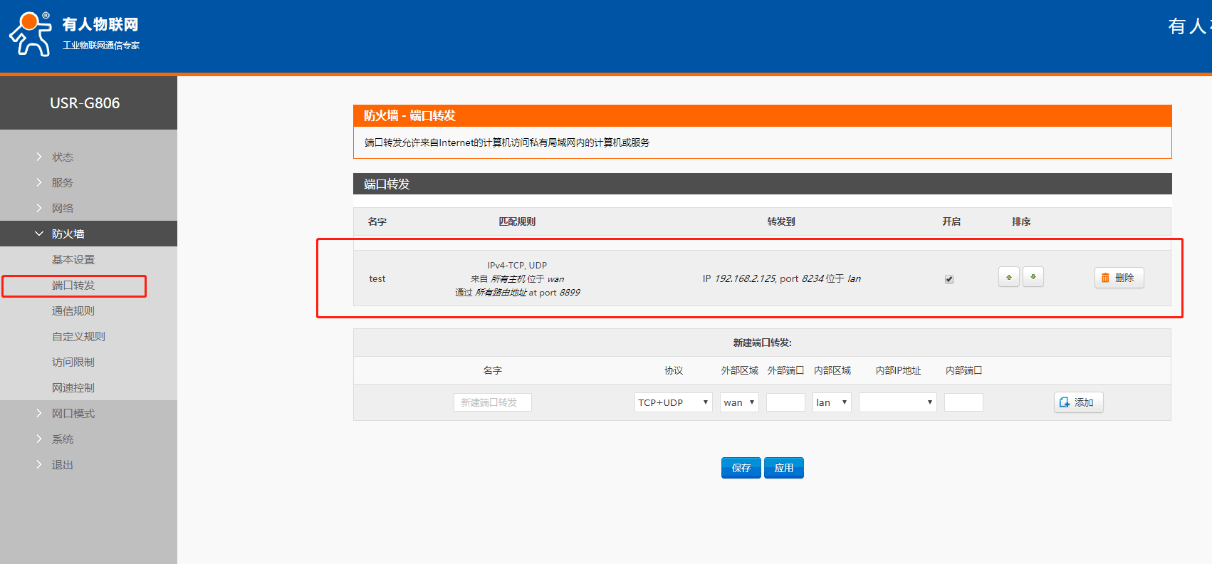 端口轉(zhuǎn)發(fā)允許來(lái)自 Internet 的計(jì)算機(jī)訪問(wèn)私有局域網(wǎng)內(nèi)的計(jì)算機(jī)或服務(wù)。如下改配置的意思是允許和 wan 口相同網(wǎng)段的地址通過(guò) 100 端口訪問(wèn)到 wan 口下的 192.168.1.214 的 200 端口。