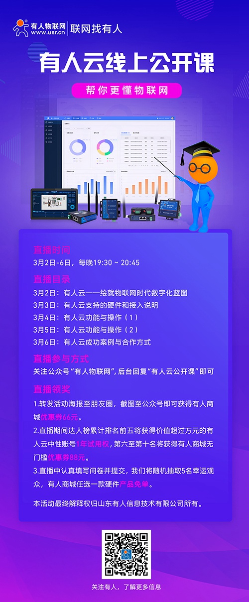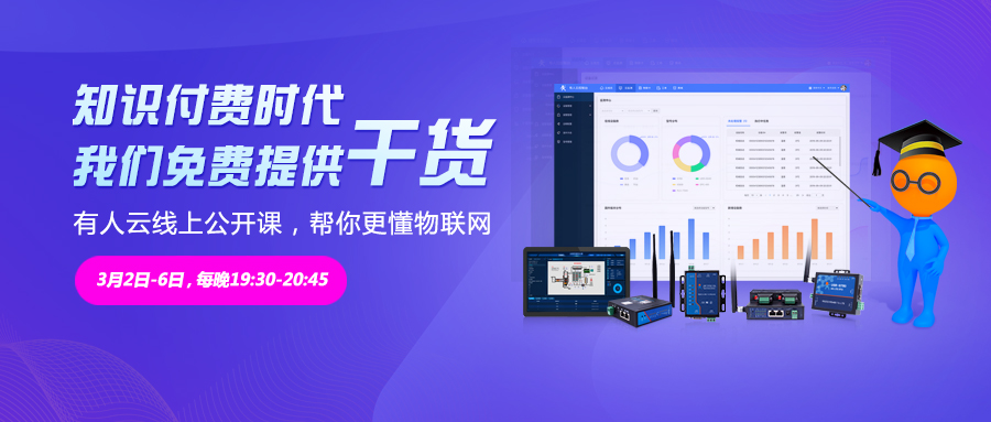 3月2日-6日、每天19點(diǎn)30-20點(diǎn)45,我們正式推出“有人云線上公開課”,特邀有人物聯(lián)網(wǎng)CIO、軟件事業(yè)部總監(jiān)王偉攜一眾技術(shù)、銷售精英,為大家詳解有人云產(chǎn)品知識(shí),幫助大家選擇一個(gè)好的、合適的物聯(lián)網(wǎng)云平臺(tái)。