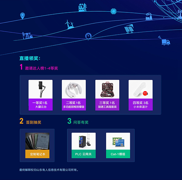 除在現(xiàn)場(chǎng)進(jìn)行常規(guī)展示外,有人物聯(lián)網(wǎng)還將開放線上直播間,為異地客戶提供“云參展”服務(wù)。屆時(shí),我們將邀請(qǐng)重磅嘉賓帶來“有人物聯(lián)網(wǎng)新技術(shù)分享”,為大家提供“智能硬件上云服務(wù)”、“智能方案展示”、“5G/Cat-1/NB-IoT新產(chǎn)品介紹”等直播干貨,期間好禮不斷,歡迎大家參加。