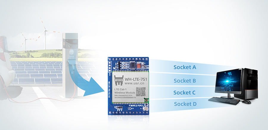 串口設(shè)備通過(guò)7S1與網(wǎng)絡(luò)服務(wù)器相連進(jìn)行數(shù)據(jù)雙向透?jìng)?,產(chǎn)品支持四路Socket鏈接,彼此相互獨(dú)立。