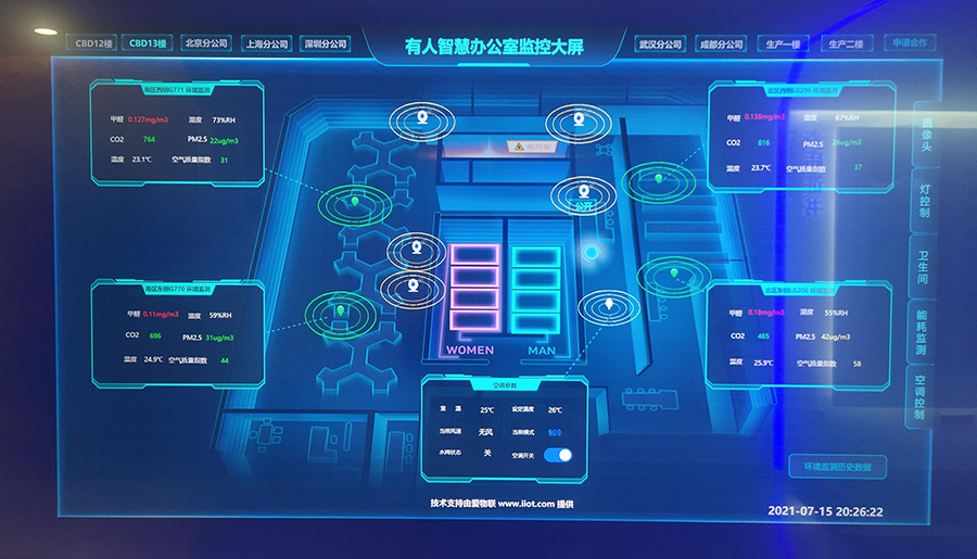 ● 環(huán)境監(jiān)控:我們加上環(huán)境傳感器,可以采集辦公室的甲醛、溫度、濕度以及二氧化碳和PM2.5的含量。例如公司內(nèi)研發(fā)同事比較多,如果二氧化碳比較高“標(biāo)紅”的話,可以通過開創(chuàng)、開新風(fēng)系統(tǒng)的方式提升我們的氧氣含量,提高我們的工作效率