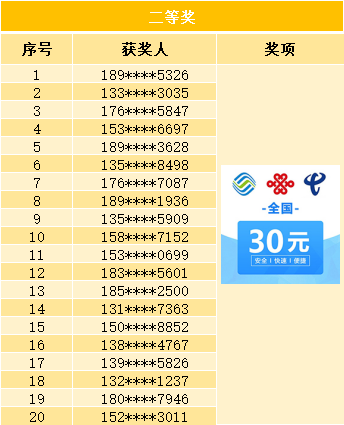 ● 二等獎(jiǎng)30元話費(fèi)(20名)