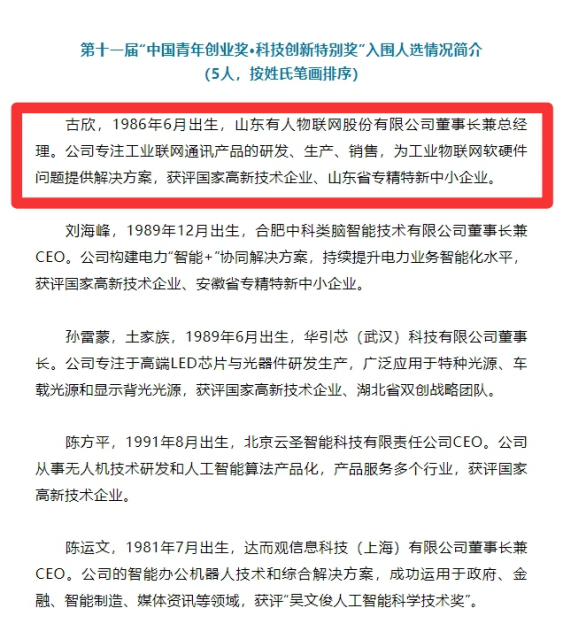近日,在中國共產(chǎn)黨成立100周年之際,共青團中央、人力資源社會保障部聯(lián)合開展第十一屆“中國青年創(chuàng)業(yè)獎”評選表彰活動。經(jīng)過前期報名、初審、復(fù)評、終評等階段,有人物聯(lián)網(wǎng)創(chuàng)始人古欣成功入圍第十一屆“中國青年創(chuàng)業(yè)獎?科技創(chuàng)新特別獎”評選名單。