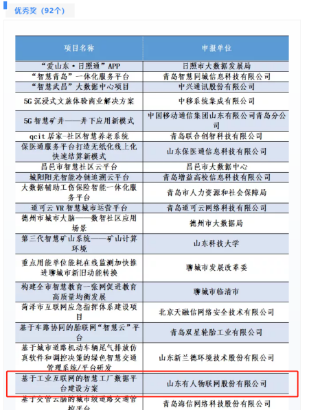 近日,由國家信息中心指導(dǎo),山東省大數(shù)據(jù)局主辦的第一屆新型智慧城市大賽頒獎(jiǎng)儀式在青島市完美收官。有人物聯(lián)網(wǎng)申請(qǐng)的基于物聯(lián)網(wǎng)化的智慧農(nóng)業(yè)監(jiān)測(cè)解決方案、綜合商務(wù)樓宇物業(yè)設(shè)備管理智能化改造解決方案和基于工業(yè)互聯(lián)網(wǎng)的智慧工廠數(shù)據(jù)平臺(tái)建設(shè)方案在全國20個(gè)省、48個(gè)市的2000個(gè)參賽項(xiàng)目,突出重圍,三次上榜第一屆中國新型智慧城市創(chuàng)新應(yīng)用大賽?興業(yè)賽道獲獎(jiǎng)名單,分別獲二等獎(jiǎng)“智優(yōu)獎(jiǎng)”、三等獎(jiǎng)“智佳獎(jiǎng)”、優(yōu)秀獎(jiǎng)“智成獎(jiǎng)”。這極大程度彰顯了有人物聯(lián)網(wǎng)在數(shù)字產(chǎn)業(yè)化、產(chǎn)業(yè)數(shù)字化方面的解決方案的高推廣價(jià)值和高商業(yè)價(jià)值,展示了有人物聯(lián)網(wǎng)在智慧城市建設(shè)方面的卓越能力和強(qiáng)大實(shí)力。