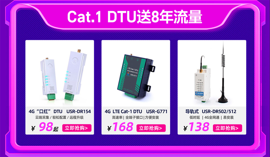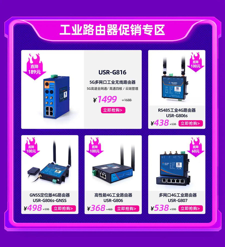 多款產品1元秒:四次秒殺環(huán)節(jié)(3點、3點半、4點半、5點),5G工業(yè)路由器、Cat.1DTU 、串口服務器、4G 工業(yè)路由器,價值千元產品一元到手!