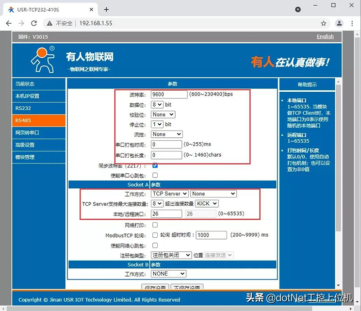 切換到RS485設(shè)置頁面,主要是設(shè)置一下串口參數(shù)和Socket參數(shù)。