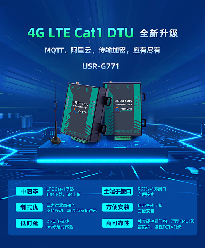 G771是有人物聯(lián)網(wǎng)為實現(xiàn)終端設(shè)備和服務(wù)器平臺端之間數(shù)據(jù)通信而開發(fā)的Cat1 DTU產(chǎn)品。為進(jìn)一步優(yōu)化產(chǎn)品傳輸性能,有人對系統(tǒng)進(jìn)行了重大改進(jìn)和升級。新版本增加了MQTT協(xié)議、SSL加密的功能,適用性更強(qiáng),數(shù)據(jù)傳輸更安全。