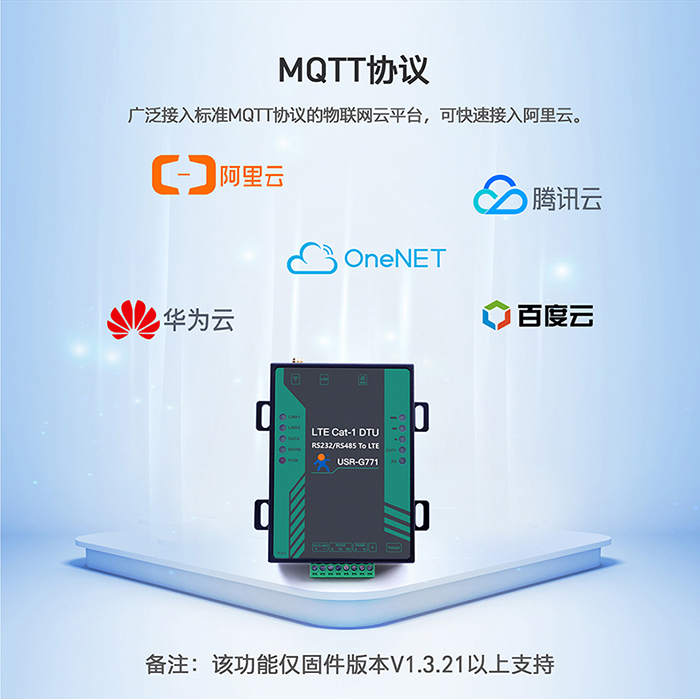 1、可對接各種開放云平臺:主流阿里云、騰訊云、百度云、亞馬遜云、OneNet等物聯(lián)網(wǎng)云平臺均基于MQTT協(xié)議,G771均可對接;
