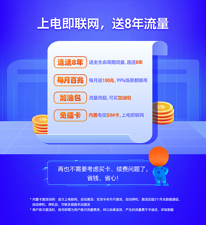 一次下單,八年無憂體驗?zāi)壳埃珿771優(yōu)惠活動正在進(jìn)行中:購買G771,有人物聯(lián)網(wǎng)即承包八年的流量,并贈送內(nèi)置eSIM貼片卡:以G771標(biāo)準(zhǔn)版為例,產(chǎn)品+八年流量僅售168元。168元,即可擁有:聯(lián)網(wǎng)能力超強(qiáng)的DTU+八年流量+有人品質(zhì)服務(wù)。八年的流量基本能覆蓋電子產(chǎn)品的生命周期,意味著全程無需用戶再自購流量,解決了充值續(xù)費(fèi)的煩惱。G771自帶焊接在電路板上的SIM卡,無需用戶自費(fèi)辦卡,并從根本上杜絕卡片松動、變形、老化、氧化、被盜等問題。