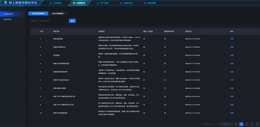 平臺(tái)提供豐富的數(shù)據(jù)模型,幫助用戶無(wú)需動(dòng)用開(kāi)發(fā)團(tuán)隊(duì)即可輕松打造動(dòng)態(tài)可視化大屏。