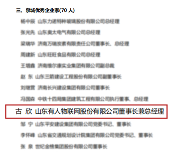5月5日,經(jīng)市委、市政府同意,濟(jì)南市優(yōu)秀企業(yè)和優(yōu)秀企業(yè)家評(píng)選表彰工作專班發(fā)布《關(guān)于濟(jì)南市優(yōu)秀企業(yè)和優(yōu)秀企業(yè)家擬表彰建議集體和個(gè)人的公示》。憑借在新時(shí)代主義現(xiàn)代化強(qiáng)省會(huì)建設(shè)的突出表現(xiàn),有人物聯(lián)網(wǎng)董事長古欣榮獲泉城優(yōu)秀企業(yè)家。