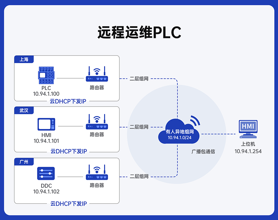 現(xiàn)在通過有人異地組網(wǎng)二層組網(wǎng)技術(shù),將全國(guó)各地終端組成大局域網(wǎng),完美解決了PLC、HMI、DDC等工業(yè)設(shè)備的遠(yuǎn)程運(yùn)維難題。