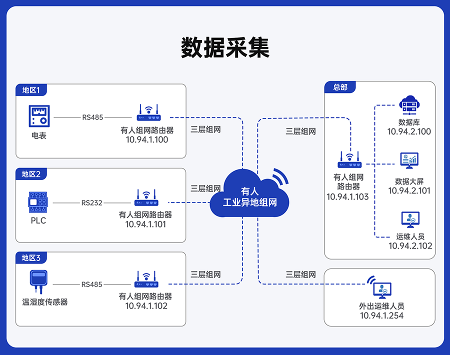 傳統(tǒng)數(shù)據(jù)采集需要通過串口服務(wù)器對(duì)接公網(wǎng)專線服務(wù)器的方式,點(diǎn)對(duì)點(diǎn)或小范圍數(shù)采扯公網(wǎng)專線年費(fèi)較高。使用有人組網(wǎng)路由器,無需公網(wǎng)即可實(shí)現(xiàn)PLC、逆變器、電表、傳感器等工業(yè)串口設(shè)備數(shù)據(jù)采集。