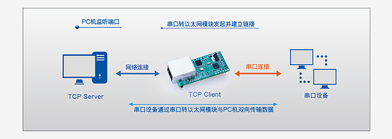 串口轉(zhuǎn)以太網(wǎng)模塊監(jiān)聽(tīng)設(shè)定的端口并等待TCP客戶(hù)端連接。