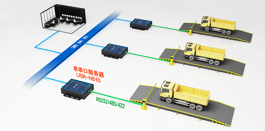 將串口服務(wù)器N510連接道閘,控制中心通過以太網(wǎng)遠程控制道閘開關(guān)。