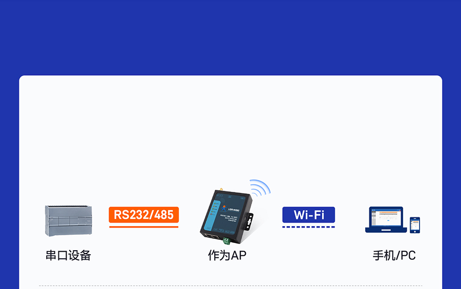 USR-w630作為無線AP使用,提供Wi-Fi接入點(diǎn)功能,可實(shí)現(xiàn)串口終端與