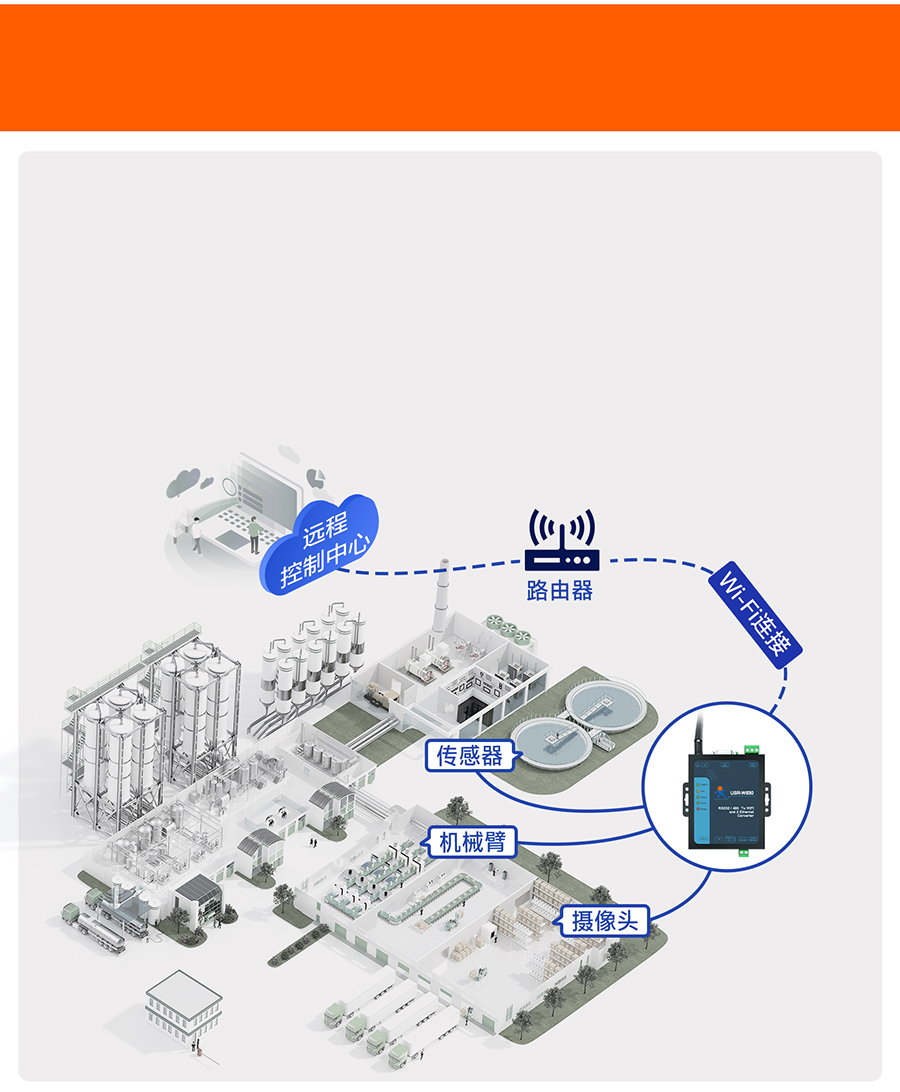 USR-w630與工廠里的串口設(shè)備相連,將設(shè)備運(yùn)行數(shù)據(jù)實(shí)時(shí)上傳至本地監(jiān)控