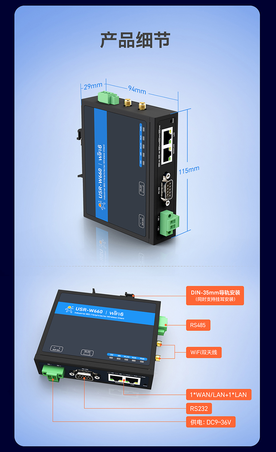 115*94*29mm(L*W*H,不含導(dǎo)軌掛耳、天線座以及安裝件)