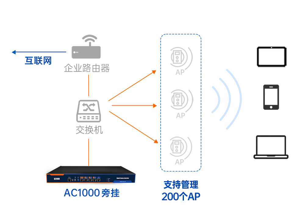 強大的硬件+靈活的組網(wǎng) AC1000旁掛使用,不直接連接到無線AP,而是通過網(wǎng)絡交換機連接。這種組網(wǎng)方式通常用于分布式網(wǎng)絡環(huán)境,AP數(shù)量相對較多,上網(wǎng)流量不經(jīng)過AC,優(yōu)異的性能讓設(shè)備可以同時管理200個AP。