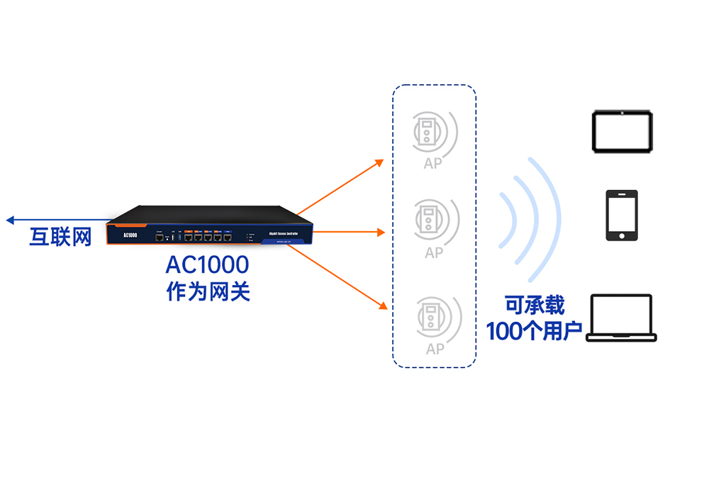 強大的硬件+靈活的組網(wǎng) AC1000作為網(wǎng)關(guān)使用,直接連接到無線AP。這種組網(wǎng)方式通常用于集中式網(wǎng)絡環(huán)境,AP數(shù)量相對較少,所有上網(wǎng)流量經(jīng)過AC,優(yōu)異的性能讓設(shè)備可以承載100個用戶的同時接入。