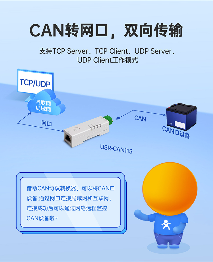 支持TCP Server、TCP Client、UDP Server、UDP Client工作模式