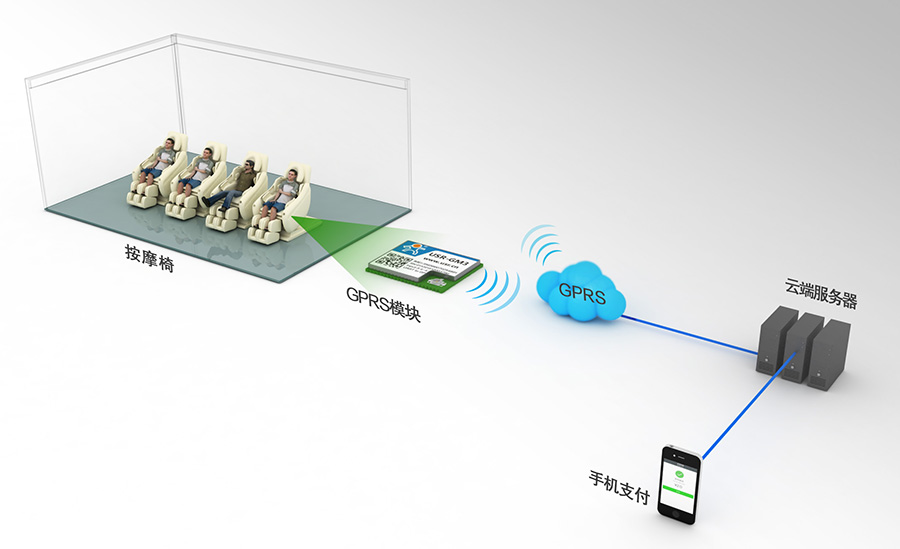 商用按摩椅采用GPRS/3/4G DTU與云端服務(wù)器進行連接,通過手機的移動支付,代替過去的傳統(tǒng)的紙幣、硬幣投幣器,顧客可以通過微信或者支付寶對椅子把手上的二維碼進行掃碼支付,手機將支付信息上傳到遠端服務(wù)器,云端服務(wù)器通過2/3/4G DTU控制按摩椅按照支付的相關(guān)費用開機運行。