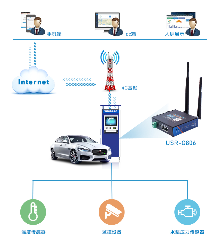 針對(duì)現(xiàn)實(shí)中遇到的問題,此處以4G工業(yè)路由器為例,描述如何幫助自助洗車機(jī)快速聯(lián)網(wǎng),從而實(shí)現(xiàn)無人操作的智能化場(chǎng)景。