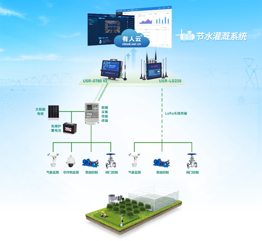 農(nóng)業(yè)節(jié)水灌溉系統(tǒng)主要由土壤水分傳感器、氣象監(jiān)測(cè)站、閥泵控制、視頻、采集控制終端、無(wú)線通訊模塊、光伏電源系統(tǒng)以及有人云農(nóng)業(yè)管理監(jiān)控平臺(tái)等組成。系統(tǒng)整合區(qū)域內(nèi)水文水情、氣象作物、工情等信息,實(shí)現(xiàn)了信息的采集、統(tǒng)計(jì)、分析、控制、調(diào)度等功能。為灌區(qū)管理部門提供科學(xué)決策依據(jù),提升灌區(qū)的管理效能,實(shí)現(xiàn)農(nóng)業(yè)灌溉自動(dòng)化。